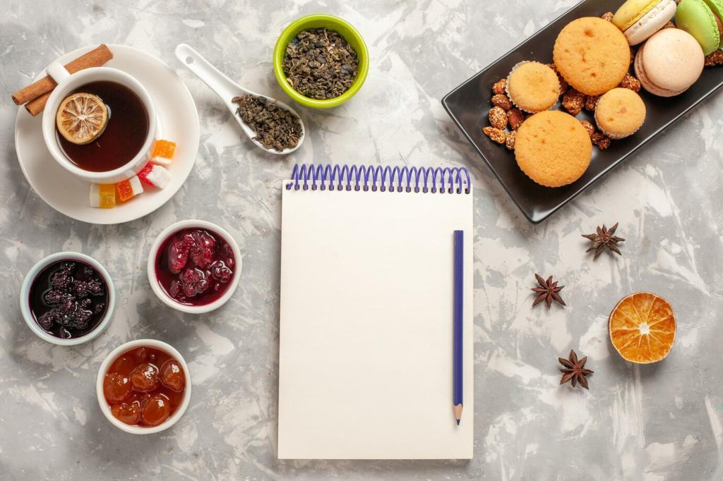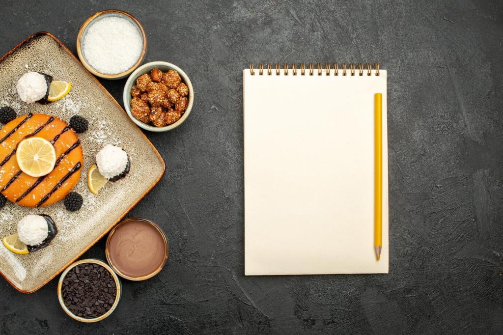 Wir strukturieren schnelle Rezepte in klare, parallel laufende Schritte: Wasser aufsetzen, schneiden, anrösten, emulsionieren. So entsteht Fluss statt Stress. Teile, welche Reihenfolge dir hilft, fokussiert und gelassen zu bleiben.
